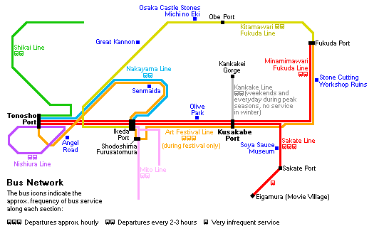 During the 2016 Setouchi Triennale an additional, almost hourly bus line, the Art Festival Line, is operated between Tonosho Port and Fukuda Port via the Senmaida area. Also, several other lines have increased departures during the festival period.